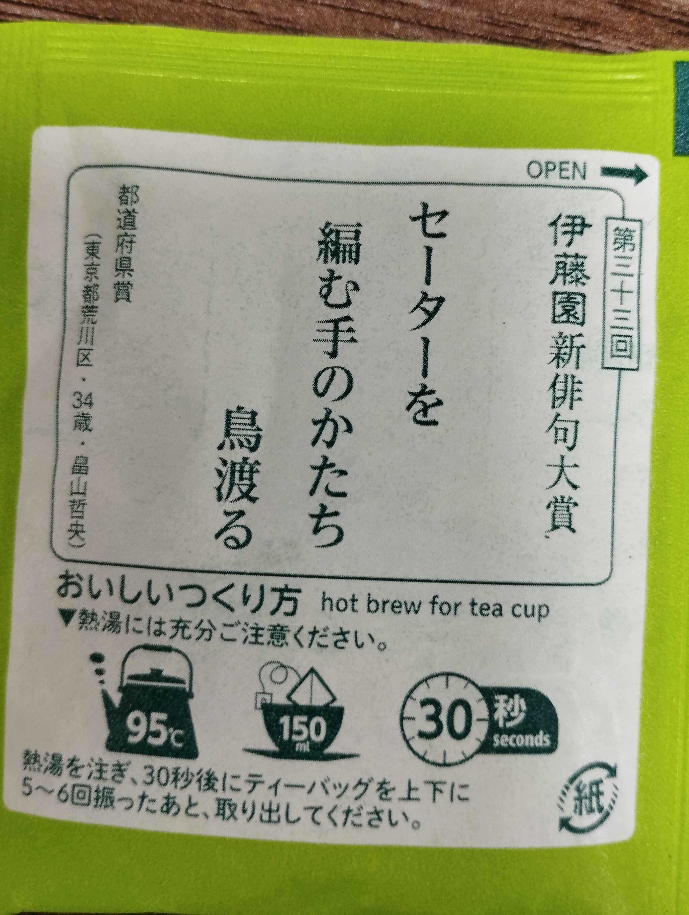 A bit of background: Ito En, the company that makes my tea, has been running a haiku competition since 1989 and publishes prizewinning entries on their packaging, handily combining two iconic aspects of Japanese culture. Winners are categorised into young children and elementary schoolers (age 12 and under), middle schoolers (age 12-15), high schoolers (age 15-18), adults under 40, and adults over 40. You can even win cash prizes of up to 50,000 yen. There’s also a competition for haiku in English, which does not require that the poems follow the traditional 5-7-5 syllable pattern.
